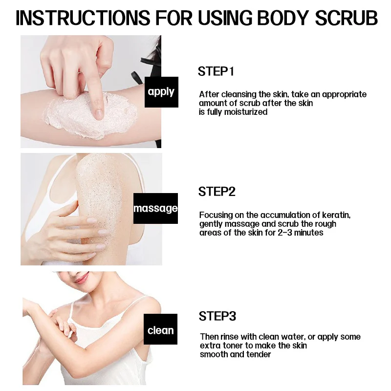 - Apply & Massage: Take an appropriate amount of scrub and apply it to the body. Focus on rough areas like elbows and knees, gently massaging in circular motions for 2-3 minutes.