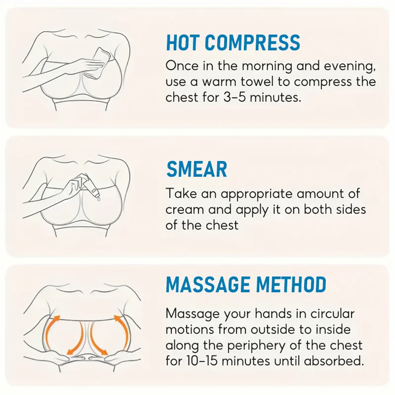 - Massage: Use circular motions with your hands, moving from outside to inside along the periphery of the chest for 10-15 minutes until fully absorbed. Use once in the morning and once in the evening for best results.