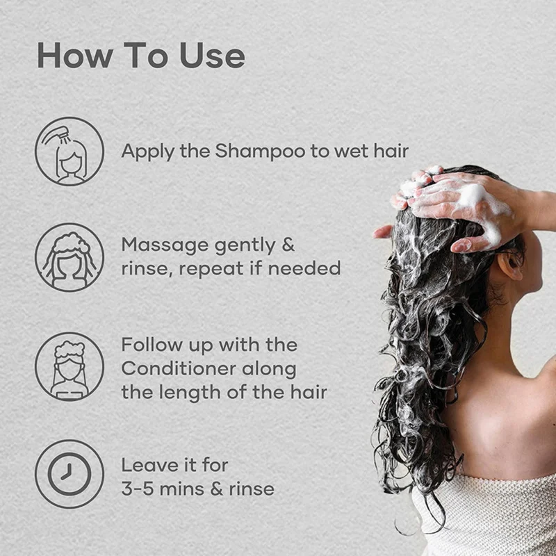 - Massage gently into the scalp and hair to create a rich foam.