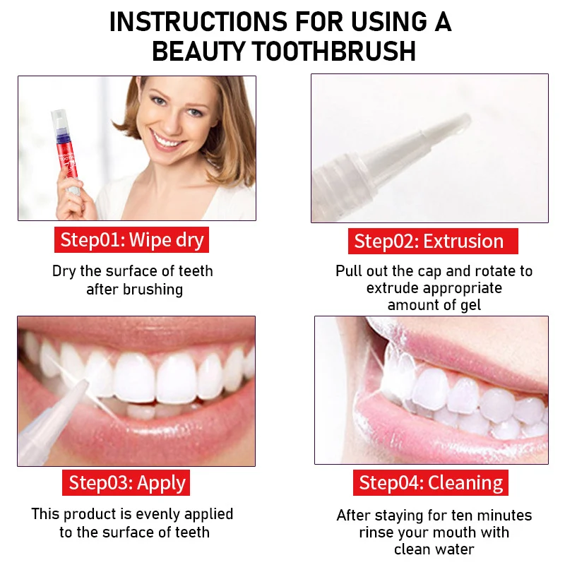 - Apply: Smile wide and apply a thin, even layer of gel to the surface of each tooth. Avoid contact with gums.